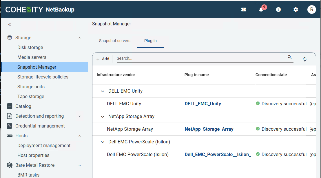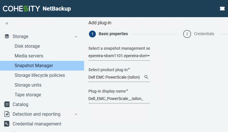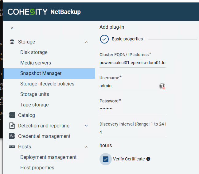 Configurar el plugin para la cabina de almacenamiento, para ello en la consola web iremos a Storage -> Snapshot Manager -> Plug-in y añadiremos uno nuevo: