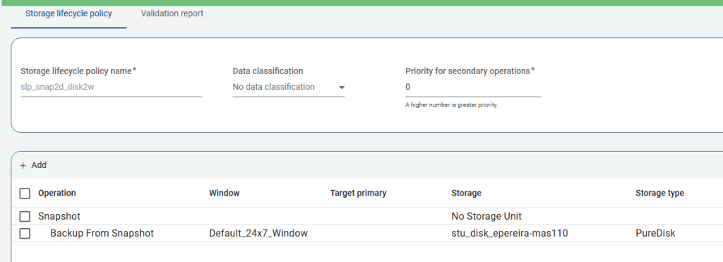 A continuación crearemos una SLP en la que tendremos una primera operación de Snapshot y una segunda de Backup From Snapshot para duplicar los datos al storage unit elegido: