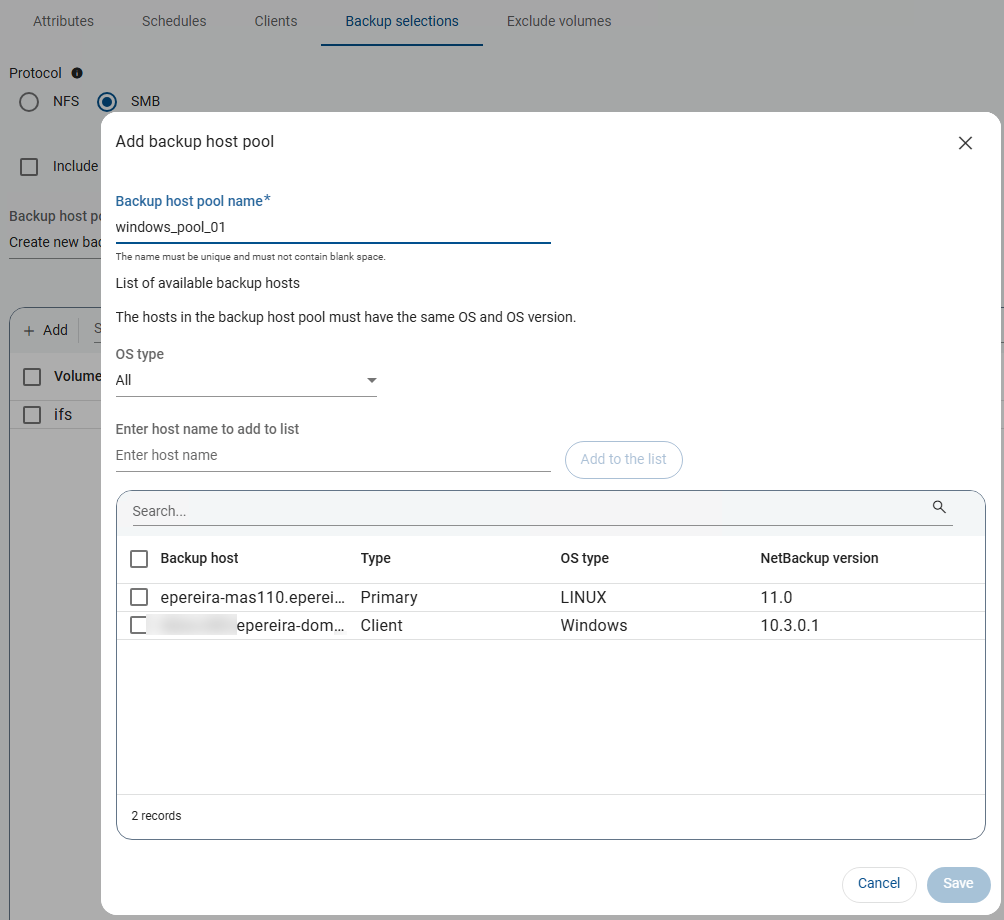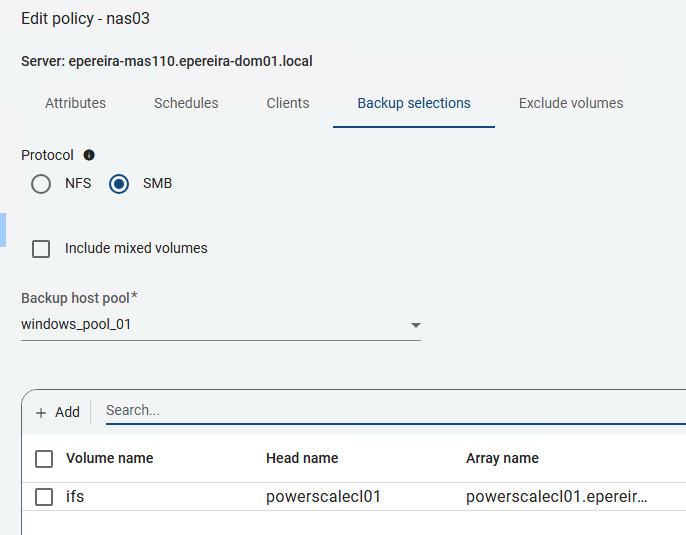 Y en backup selections los file system, el protocolo que queremos usar y un backup host pool (la primera vez será necesario crearlo añadiendo los backup host) que serán los servidores que dupliquen el snapshot al media server:
