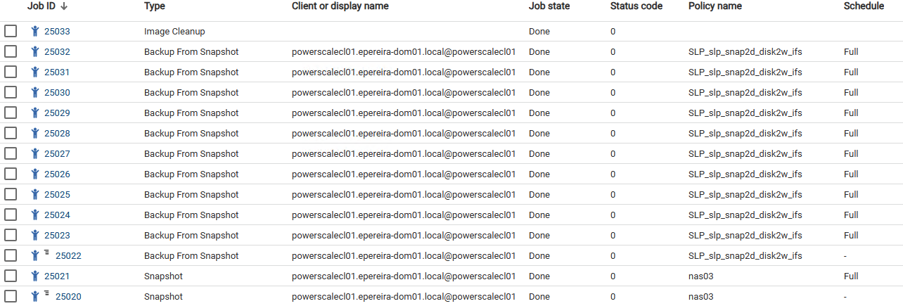 Cuando la política se ejecute, veremos un primer trabajo de Snapshot y posteriormente las duplicaciones que se harán utilizando los backup host, montando los snapshot para transferir los datos hacia las storage unit, veremos varios trabajos correspondientes a la configuración seleccionada en la política: