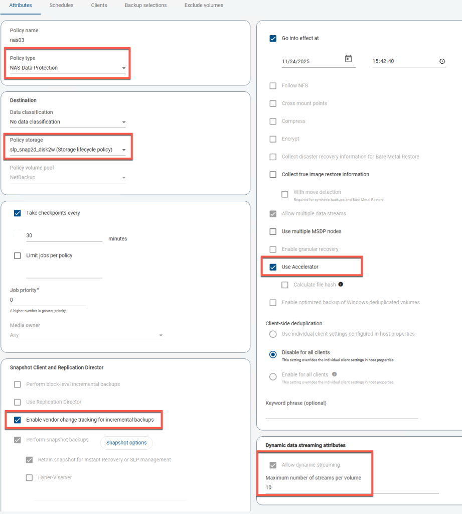 • Enable vendor change tracking for incremental backups / Use Accelerator: de esta forma se detectan los cambios comparando los dos últimos snapshots, evitando de esta forma recorrer el file system para detectarlos agilizando enormemente el proceso